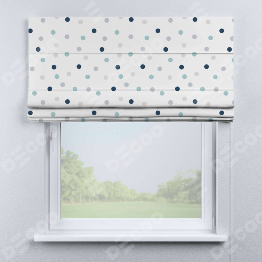 Римская штора производителя «Cortin», используется для проёма, пошита из ткани блэкаут с нанесением сублимационной печати «Точки». Имеет универсальный механизм и подходит для монтажа: на потолок, на стену и в нишу.