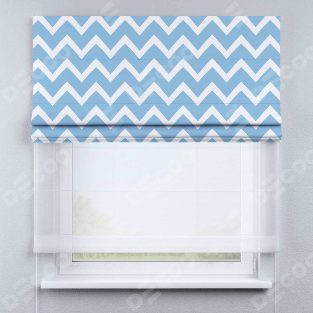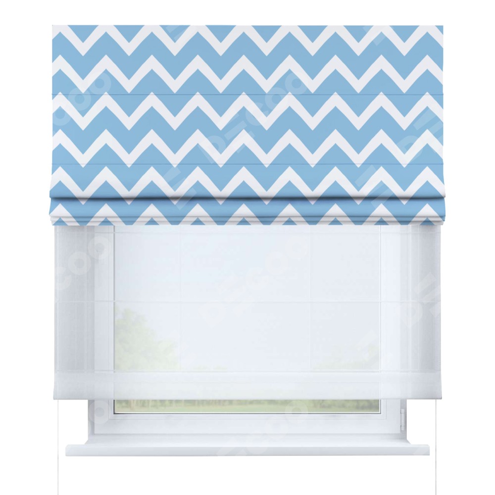 Римская штора день-ночь производителя «Cortin», используется для проёма, пошита из двух полотен, с лицевой блэкаут с нанесением сублимационной печати «Зигзаг средний», вторая ткань тюль (по стандарту комплектуется тюль белого цвета артикул V-01). Имеет универсальный механизм и подходит для монтажа: на потолок, на стену и в нишу.