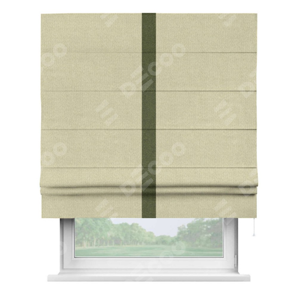 Римская штора производителя «Cortin», используется для проёма, пошита из ткани лён димаут шампань, артикул 90994. Отделка шторы кантом «Хайвэй», ткань для канта используется из льна димаут разной расцветки на выбор. Имеет универсальный механизм и подходит для монтажа: на потолок, на стену и в нишу.