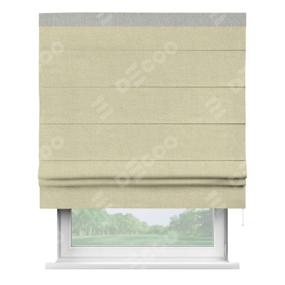 Римская штора производителя «Cortin», используется для проёма, пошита из ткани лён димаут шампань, артикул 90994. Отделка шторы кантом «Кинг», ткань для канта используется из льна димаут разной расцветки на выбор. Имеет универсальный механизм и подходит для монтажа: на потолок, на стену и в нишу.