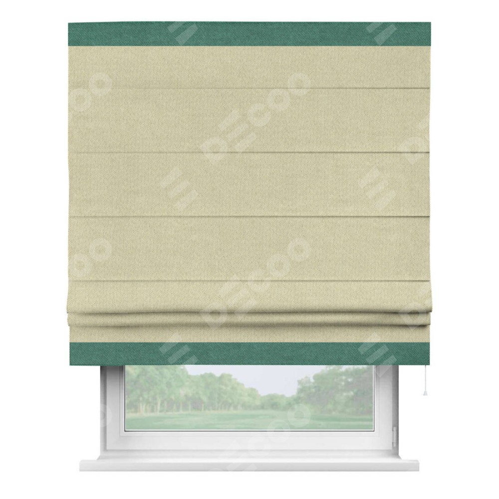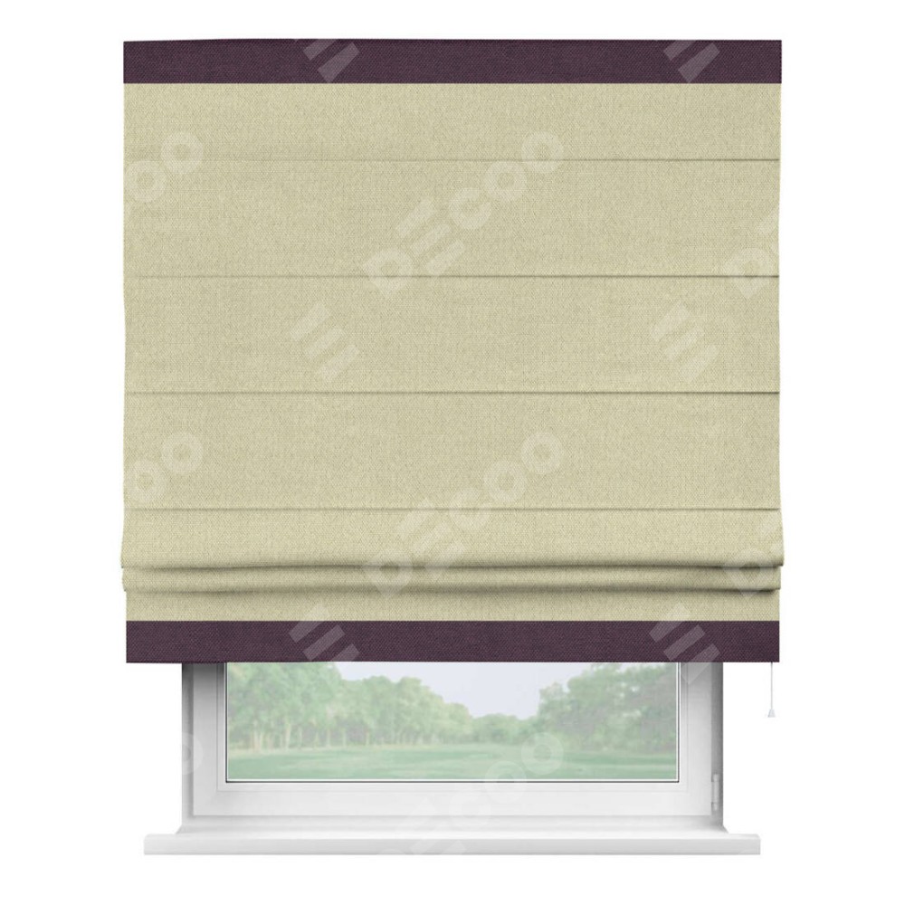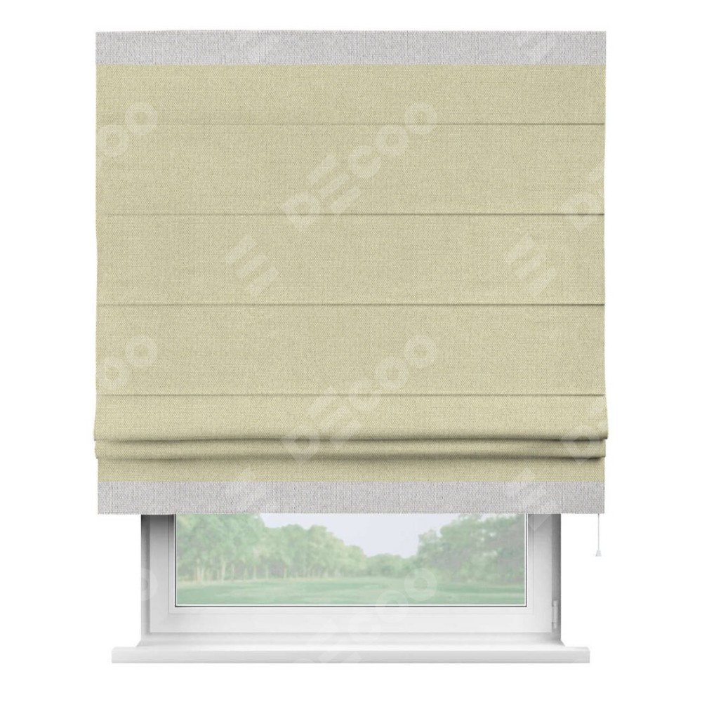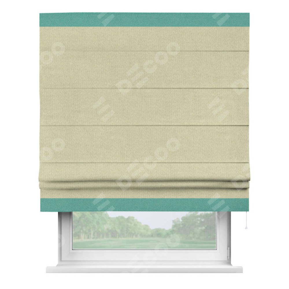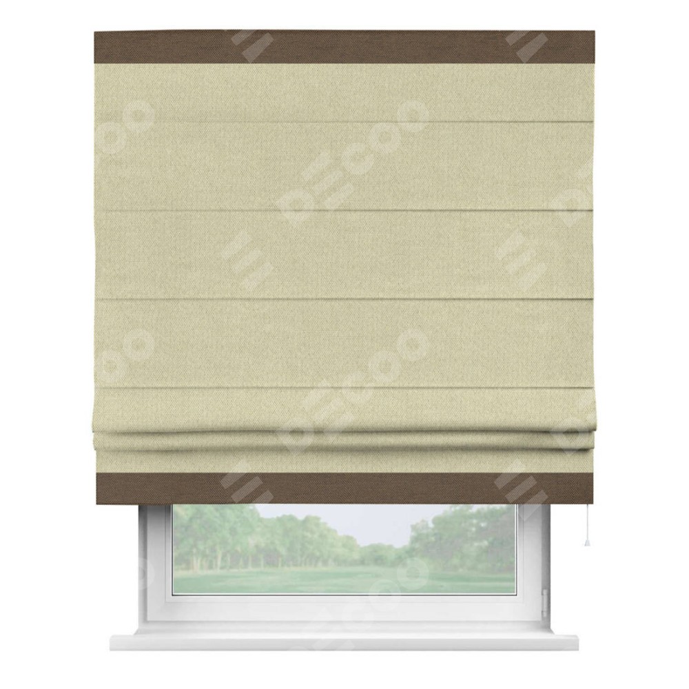 Римская штора производителя «Cortin», используется для проёма, пошита из ткани лён димаут шампань, артикул 90994. Отделка шторы кантом «Горизонт», ткань для канта используется из льна димаут разной расцветки на выбор. Имеет универсальный механизм и подходит для монтажа: на потолок, на стену и в нишу.