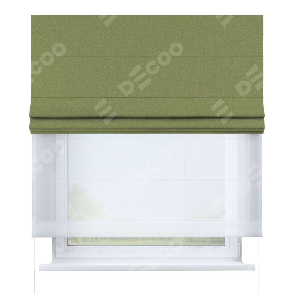 Двойная римская штора «День-ночь» от производителя Cortin предназначена для использования в проёмах. Эта штора уникальна тем, что состоит из двух полотен. На лицевой стороне находится бархат золотая оливка (артикул: 90725), обеспечивающий эффективное затемнение. В комплект также входит вторая ткань — легкий белый тюль (артикул: V-01), который добавляет изящества и легкости оформлению окна. Кроме того, доступны и другие разновидности ткани тюль, выбор которых доступен по ссылке .