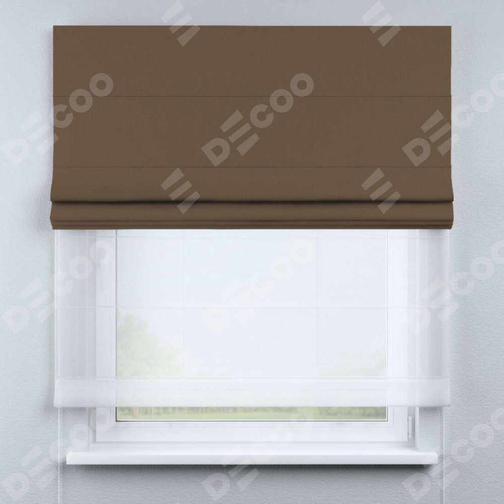 Двойная римская штора «День-ночь» от производителя Cortin предназначена для использования в проёмах. Эта штора уникальна тем, что состоит из двух полотен. На лицевой стороне находится однотонный коричневый блэкаут (артикул: 91334), обеспечивающий эффективное затемнение. В комплект также входит вторая ткань — легкий белый тюль (артикул: V-01), который добавляет изящества и легкости оформлению окна. Кроме того, доступны и другие разновидности ткани тюль, выбор которых доступен по ссылке .