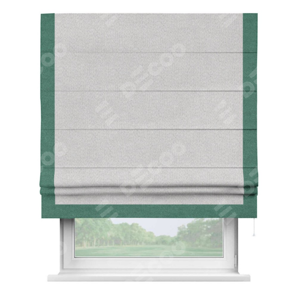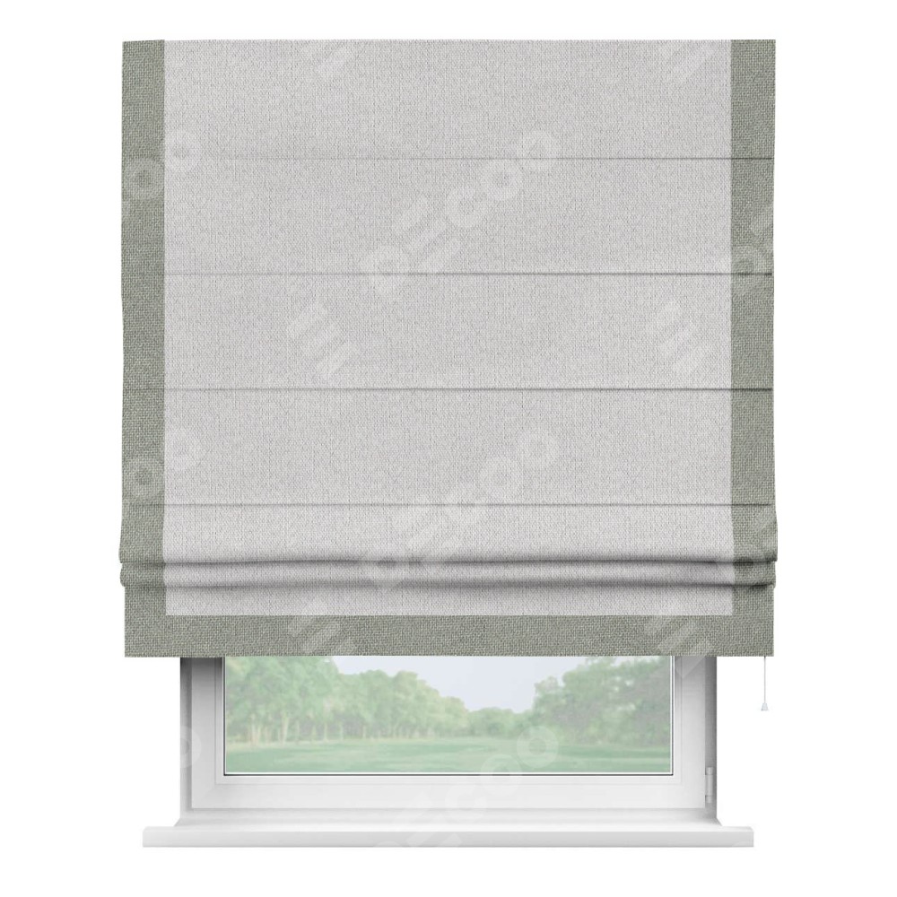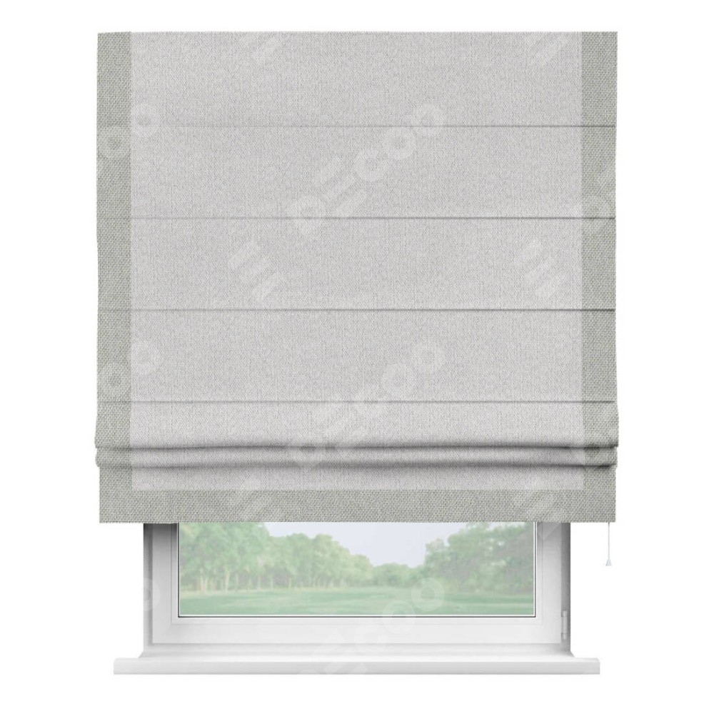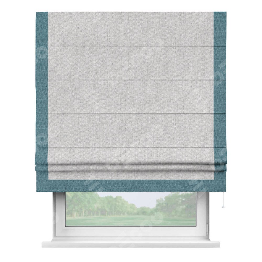 Римская штора производителя «Cortin», используется для проёма, пошита из ткани лён димаут светло-бежевый, артикул 90993. Отделка шторы кантом «Виктория», ткань для канта используется из льна димаут разной расцветки на выбор. Имеет универсальный механизм и подходит для монтажа: на потолок, на стену и в нишу.