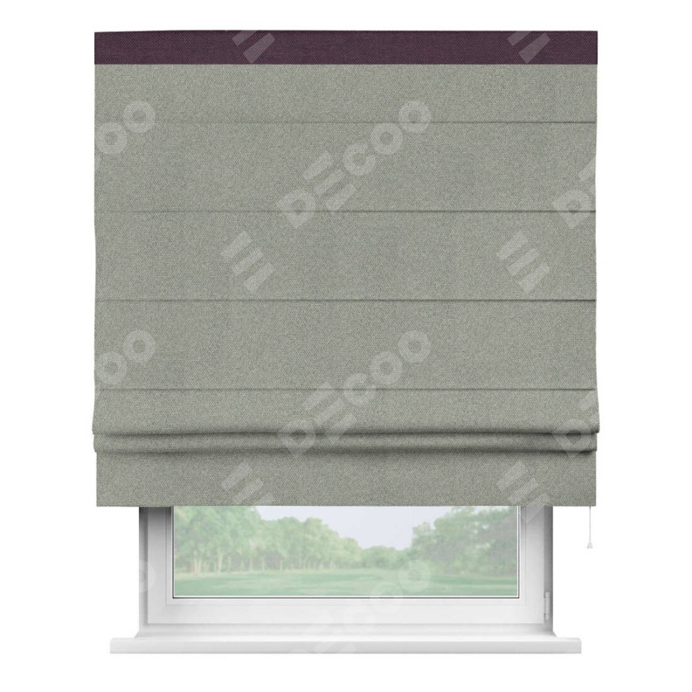 Римская штора производителя «Cortin», используется для проёма, пошита из ткани лён димаут серый, артикул 91009. Отделка шторы кантом «Кинг», ткань для канта используется из льна димаут разной расцветки на выбор. Имеет универсальный механизм и подходит для монтажа: на потолок, на стену и в нишу.