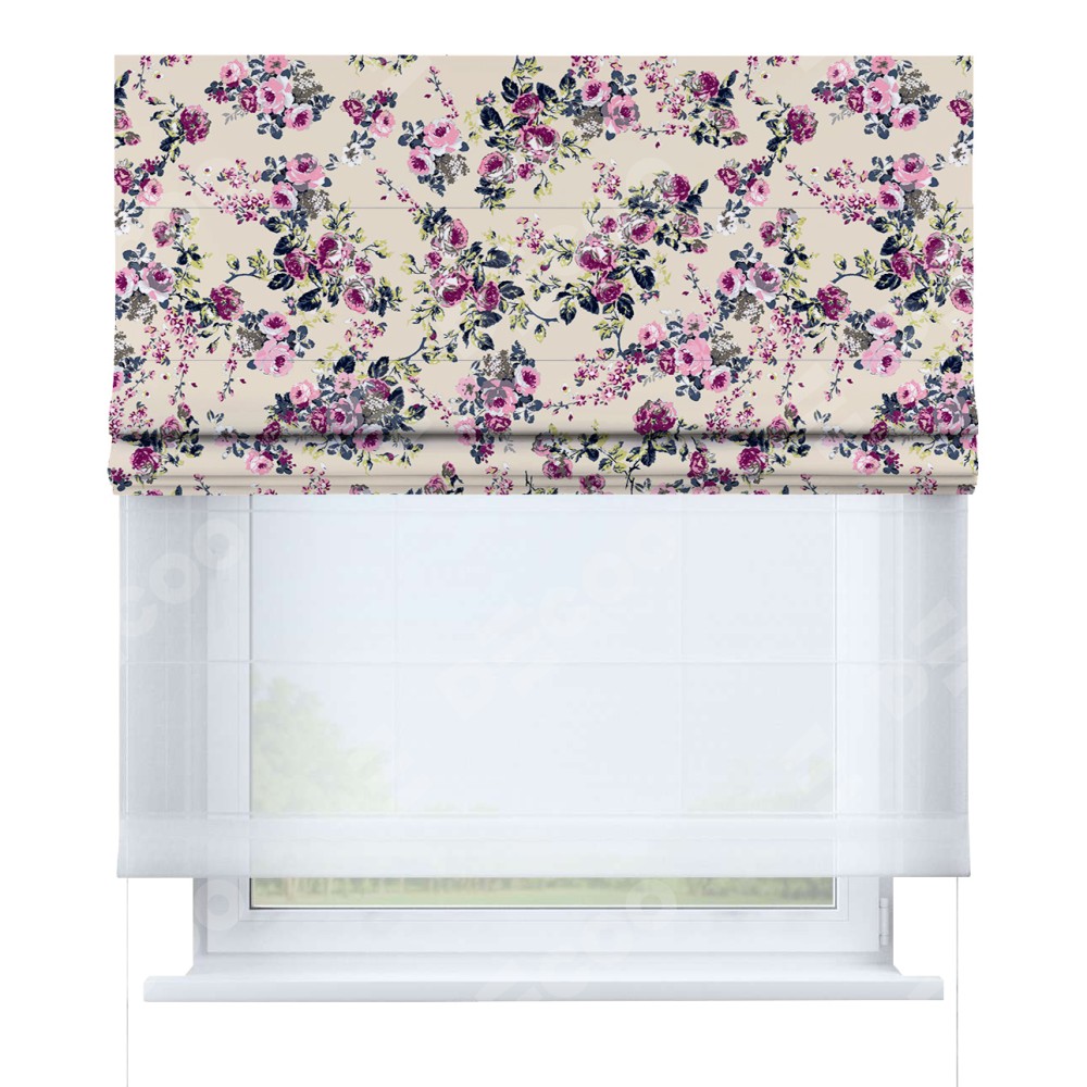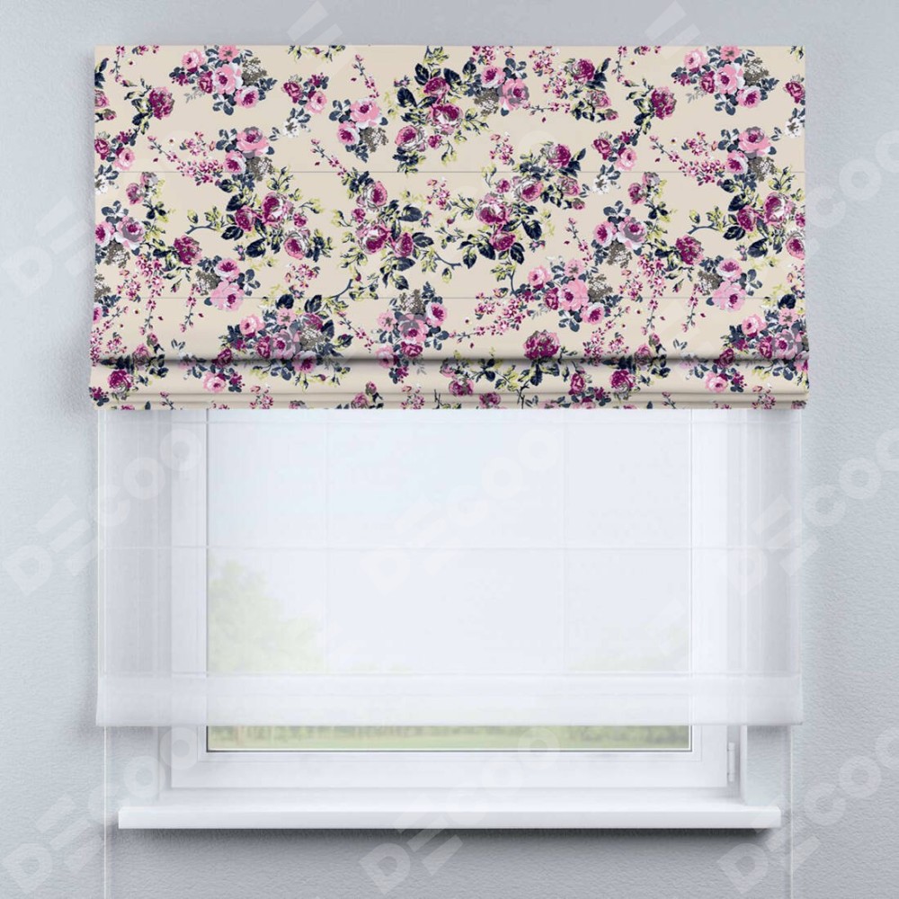 Двойная римская штора «День-ночь» от производителя Cortin предназначена для использования в проёмах. Эта штора уникальна тем, что состоит из двух полотен. На лицевой стороне находится блэкаут с нанесением сублимационной печати «Россыпь розовых цветов», обеспечивающий эффективное затемнение. В комплект также входит вторая ткань — легкий белый тюль (артикул: V-01), который добавляет изящества и легкости оформлению окна. Кроме того, доступны и другие разновидности ткани тюль, выбор которых доступен по ссылке .