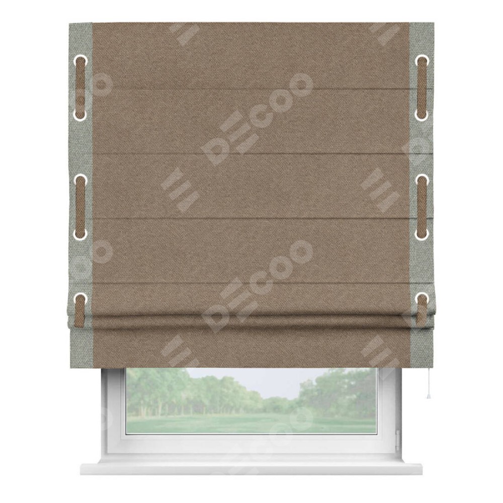 Римская штора производителя «Cortin», используется для проёма, пошита из ткани лён димаут коричневый, артикул 90996. Отделка шторы кантом «Стрим Дуо» на кантах расположены люверсы с пояском, ткань для канта используется лён димаут разной расцветки на выбор. Ткань для пояска обычно используется из основной ткани шторы, а так же можно сделать из любой расцветки по желанию. Имеет универсальный механизм и подходит для монтажа: на потолок, на стену и в нишу.