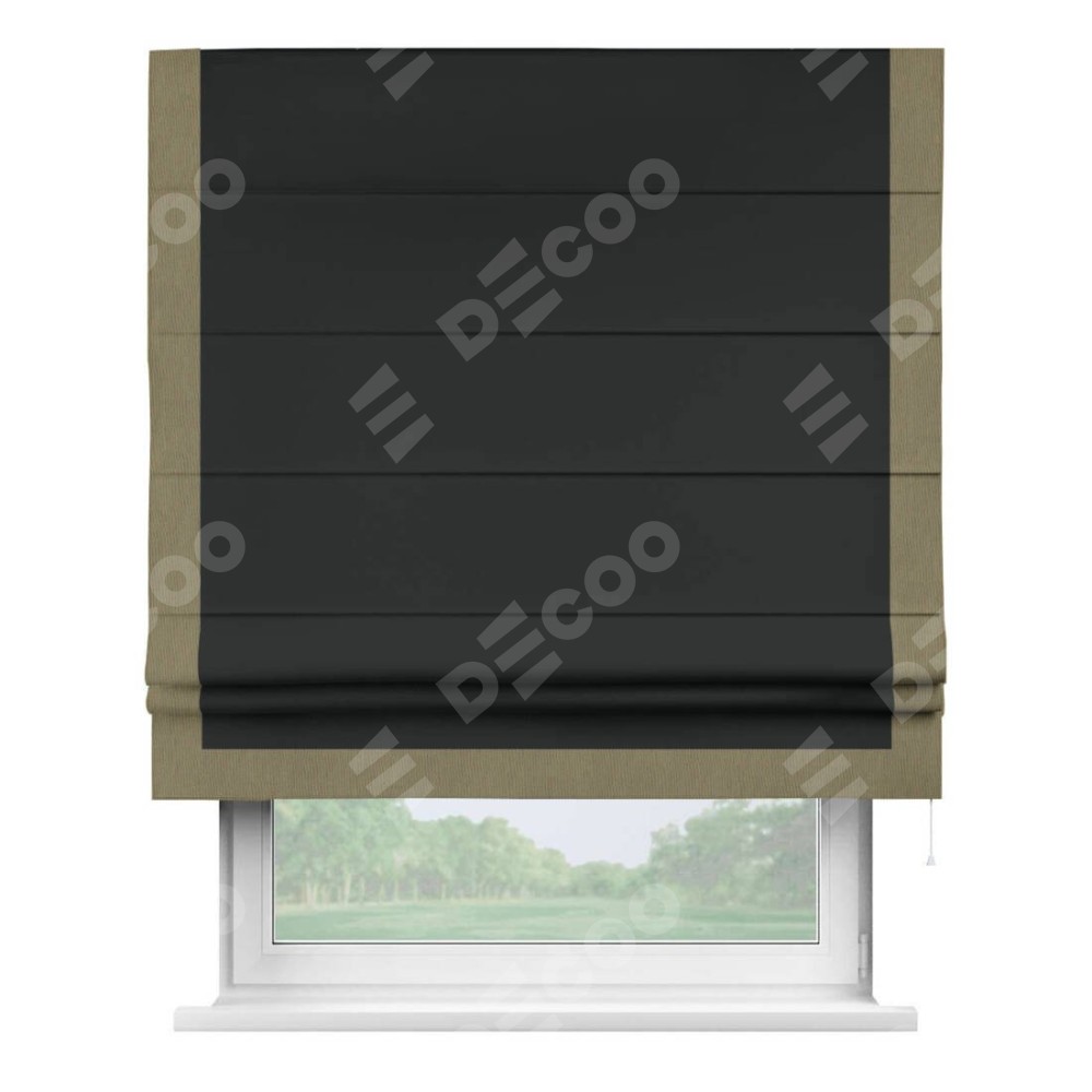 Римская штора производителя «Cortin», используется для проёма, пошита из ткани блэкаут однотонный черный, артикул ткани 91571−2. Отделка шторы кантом «Виктория», ткань для канта используется из блэкаута однотонного разной расцветки на выбор. Имеет универсальный механизм и подходит для монтажа: на потолок, на стену и в нишу.