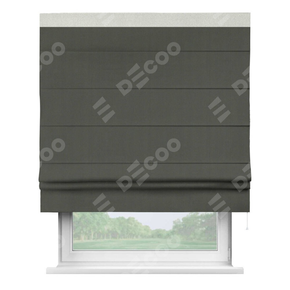 Римская штора производителя «Cortin», используется для проёма, пошита из ткани блэкаут однотонный дымчато-серый, артикул ткани 91571−1. Отделка шторы кантом «Кинг», ткань для канта используется из блэкаута однотонного разной расцветки на выбор. Имеет универсальный механизм и подходит для монтажа: на потолок, на стену и в нишу.