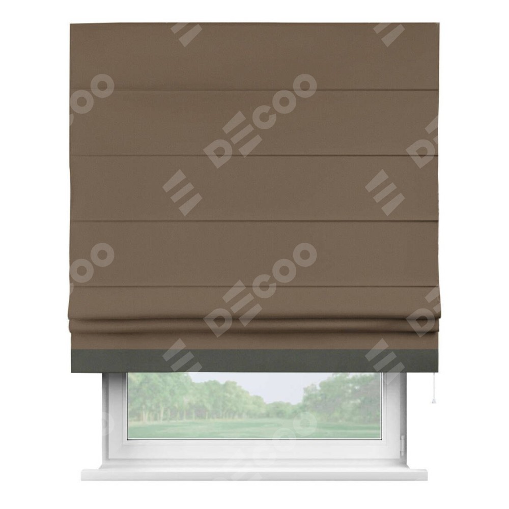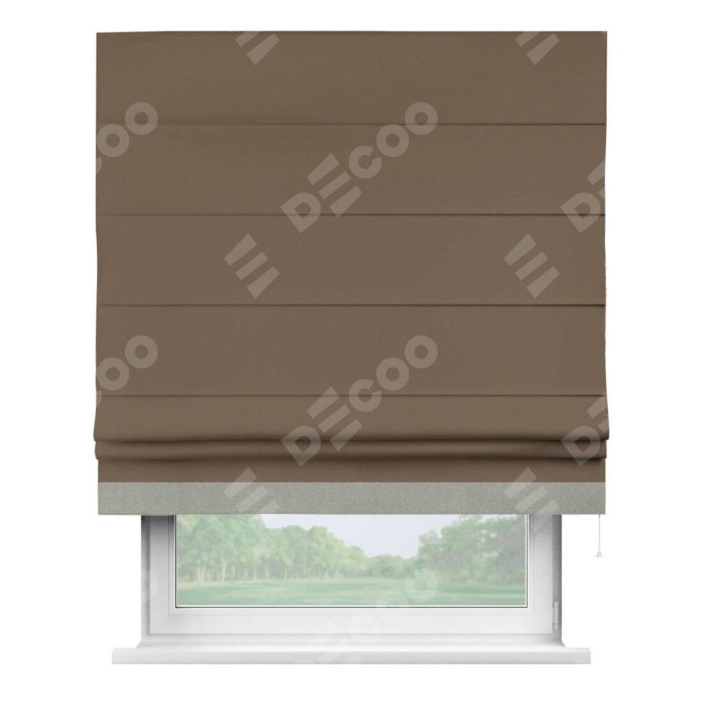 Римская штора производителя «Cortin», используется для проёма, пошита из ткани блэкаут однотонный коричневый, артикул ткани 91334. Отделка шторы кантом «Джестер», ткань для канта используется из блэкаута однотонного разной расцветки на выбор. Имеет универсальный механизм и подходит для монтажа: на потолок, на стену и в нишу.