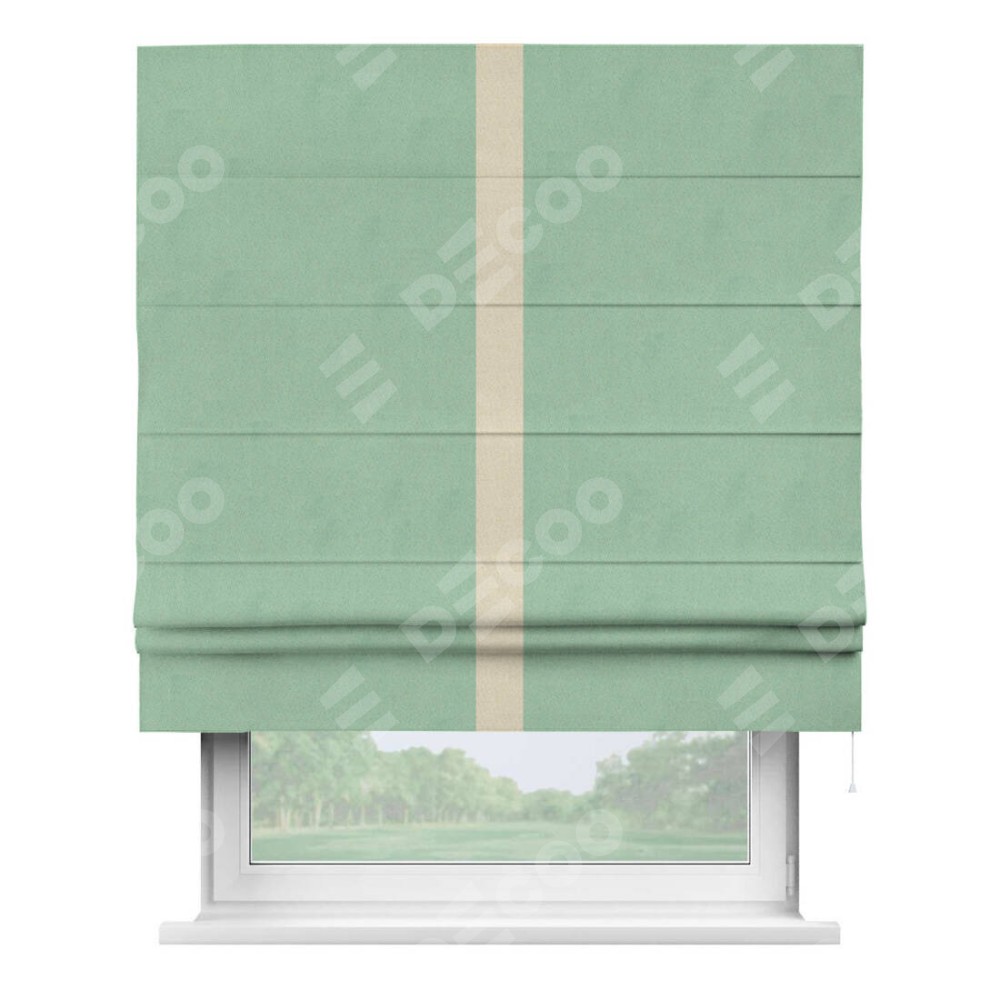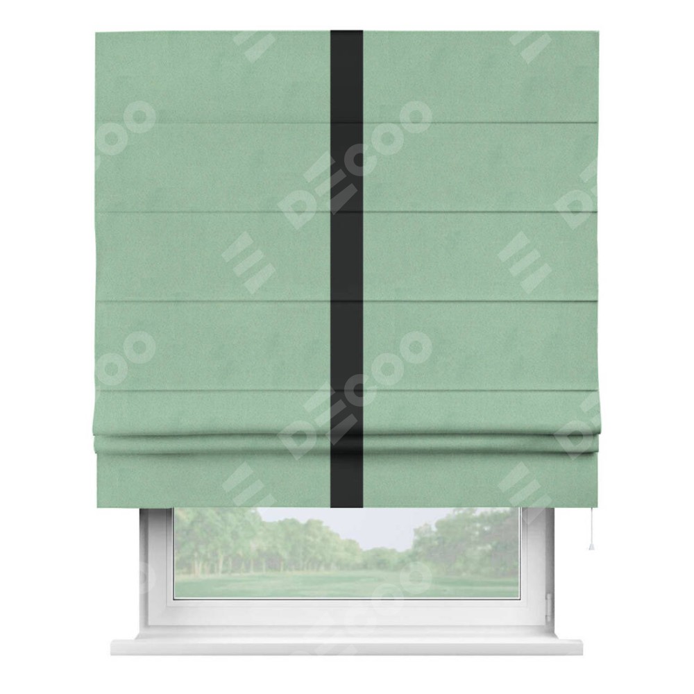 Римская штора производителя «Cortin», используется для проёма, пошита из ткани блэкаут однотонный ментоловый, артикул ткани 91572−1. Отделка шторы кантом «Хайвей», ткань для канта используется из блэкаута однотонного разной расцветки на выбор. Имеет универсальный механизм и подходит для монтажа: на потолок, на стену и в нишу.