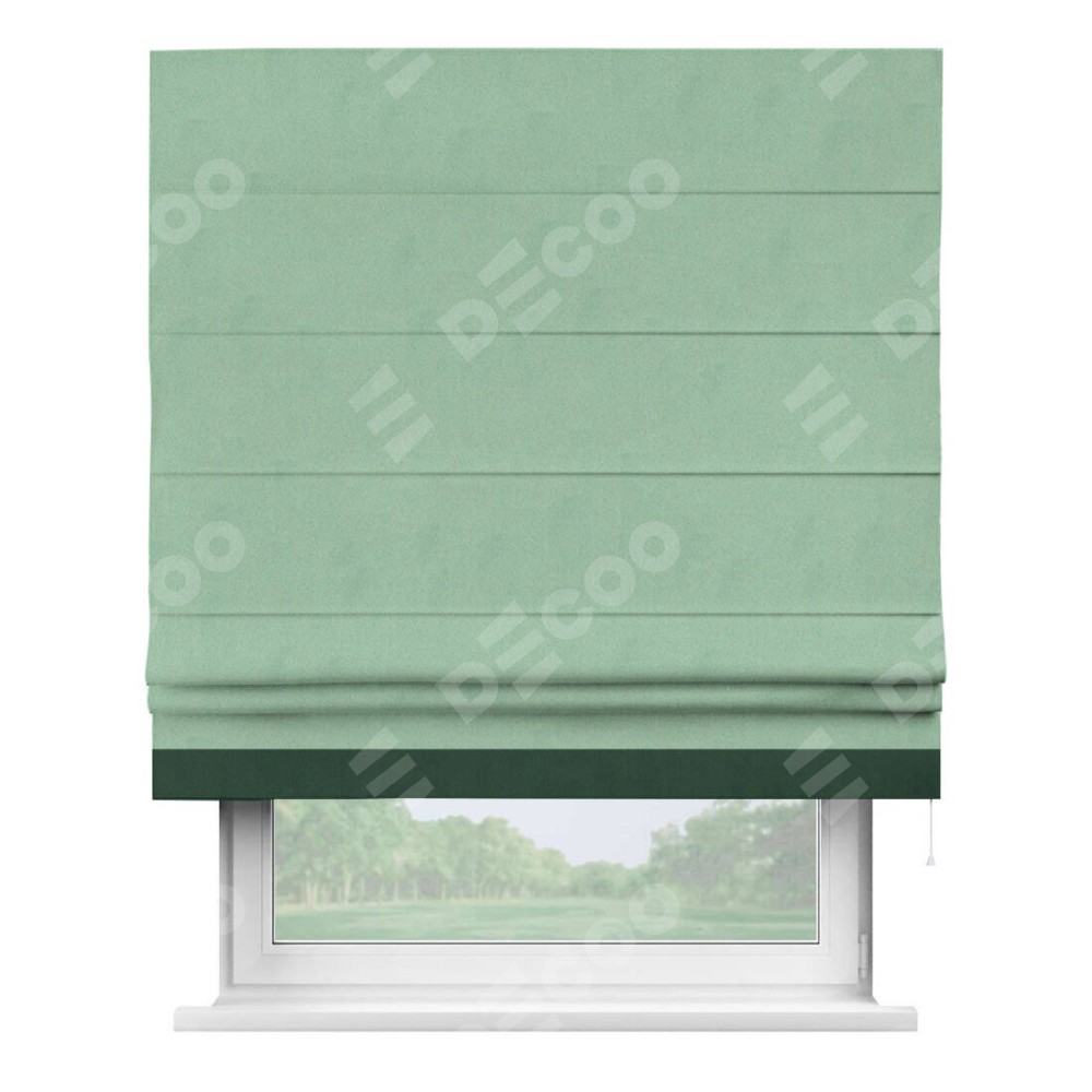 Римская штора производителя «Cortin», используется для проёма, пошита из ткани блэкаут однотонный ментоловый, артикул ткани 91572−1. Отделка шторы кантом «Джестер», ткань для канта используется из блэкаута однотонного разной расцветки на выбор. Имеет универсальный механизм и подходит для монтажа: на потолок, на стену и в нишу.