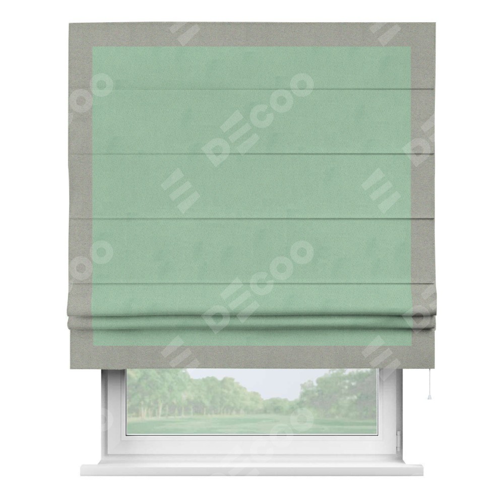 Римская штора производителя «Cortin», используется для проёма, пошита из ткани блэкаут однотонный ментоловый, артикул ткани 91572−1. Отделка шторы кантом «Чесс», ткань для канта используется из блэкаута однотонного разной расцветки на выбор. Имеет универсальный механизм и подходит для монтажа: на потолок, на стену и в нишу.
