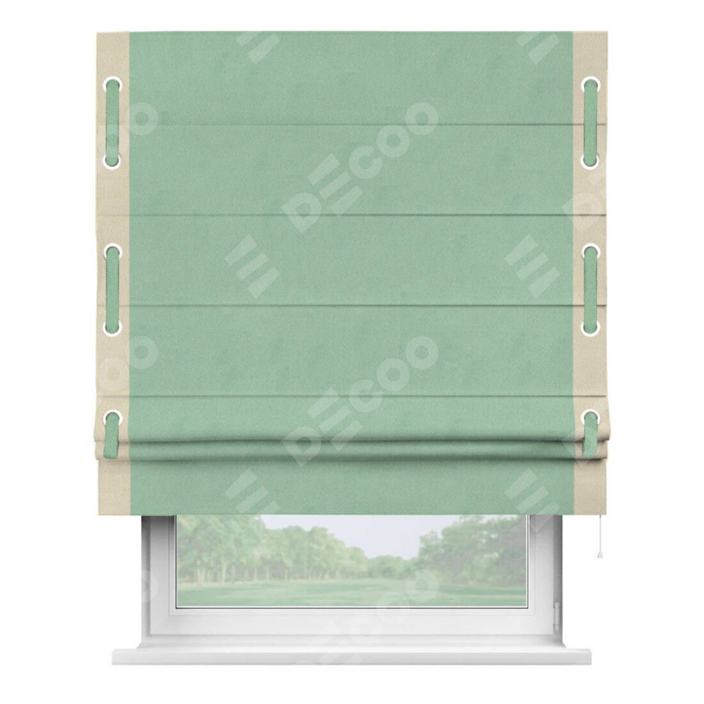 Римская штора производителя «Cortin», используется для проёма, пошита из ткани блэкаут однотонный ментоловый, артикул ткани 91572−1. Отделка шторы кантом «Стрим Дуо» на кантах расположены люверсы с пояском, ткань для канта используется из блэкаута однотонного разной расцветки на выбор. Ткань для пояска обычно используется из основной ткани шторы, а так же можно сделать из любой расцветки по желанию. Имеет универсальный механизм и подходит для монтажа: на потолок, на стену и в нишу.