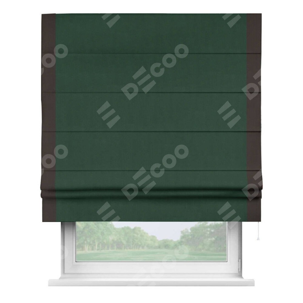 Римская штора производителя «Cortin», используется для проёма, пошита из ткани блэкаут однотонный зелёный, артикул ткани 91572−2. Отделка шторы кантом «Стрим Дуо», ткань для канта используется из блэкаута однотонного разной расцветки на выбор. Имеет универсальный механизм и подходит для монтажа: на потолок, на стену и в нишу.