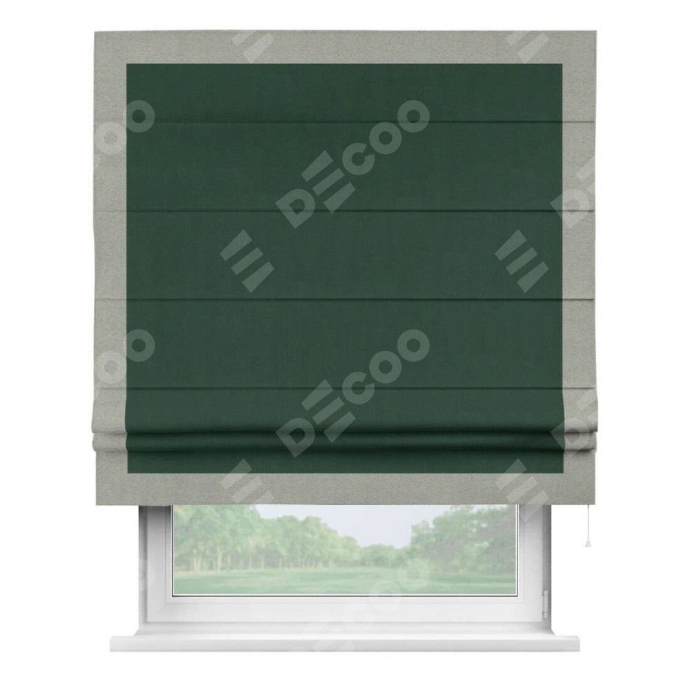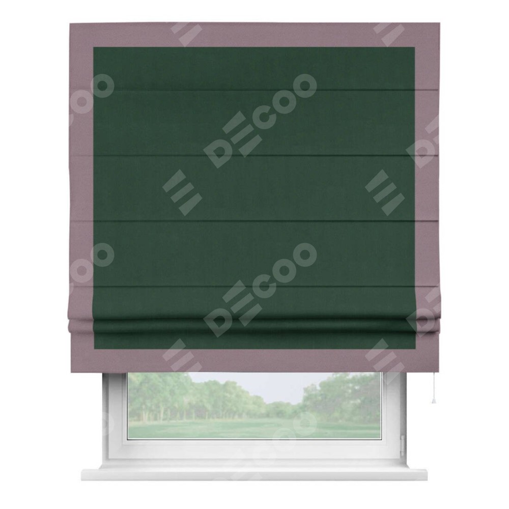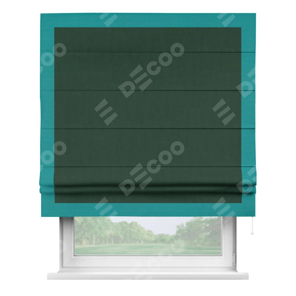 Римская штора производителя «Cortin», используется для проёма, пошита из ткани блэкаут однотонный зелёный, артикул ткани 91572−2. Отделка шторы кантом «Чесс», ткань для канта используется из блэкаута однотонного разной расцветки на выбор. Имеет универсальный механизм и подходит для монтажа: на потолок, на стену и в нишу.
