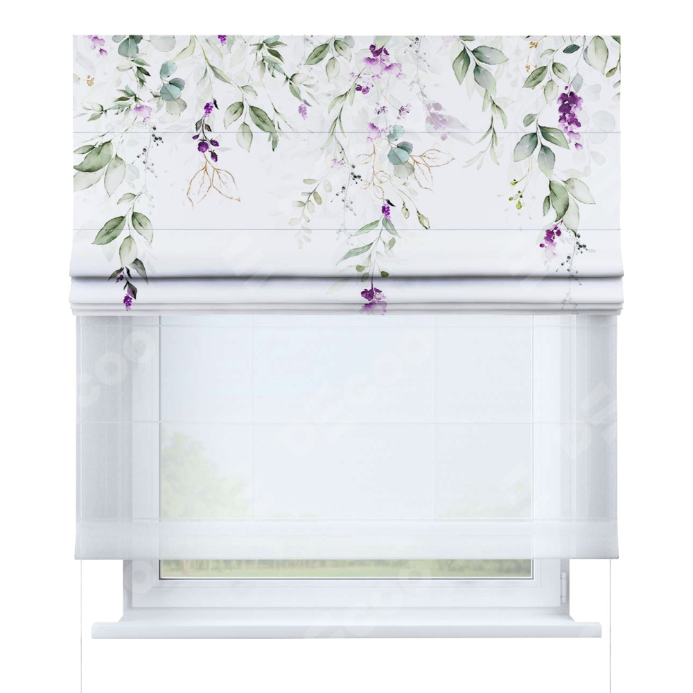 Двойная римская штора «День-ночь» от производителя Cortin предназначена для использования в проёмах. Эта штора уникальна тем, что состоит из двух полотен. На лицевой стороне находится блэкаут с нанесением сублимационной печати «Цветочный водопад», обеспечивающий эффективное затемнение. В комплект также входит вторая ткань — легкий белый тюль (артикул: V-01), который добавляет изящества и легкости оформлению окна. Кроме того, доступны и другие разновидности ткани тюль, выбор которых доступен по ссылке .
