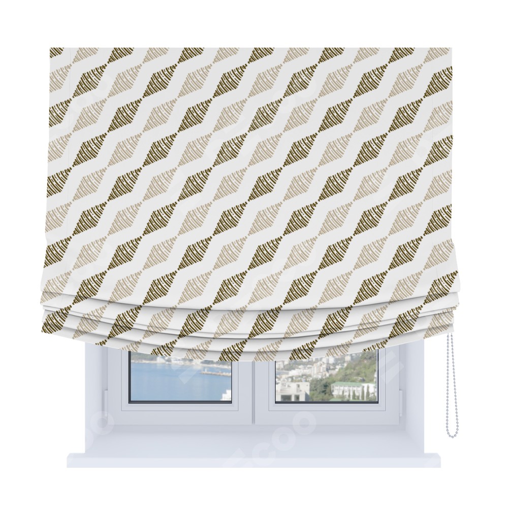 Римская штора Soft производителя «Cortin», используется для проёма, пошита из ткани блэкаут с нанесением сублимационной печати «Диагональные ромбы». Имеет универсальный механизм и подходит для монтажа: на потолок, на стену и в нишу. В отличие от стандартных римских штор, римская штора Soft не имеет горизонтальных вставок и нижнего отвеса. Это позволяет ткани произвольно драпироваться в свободные мягкие складки.