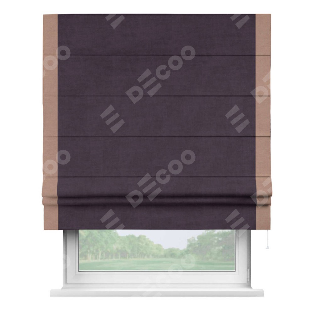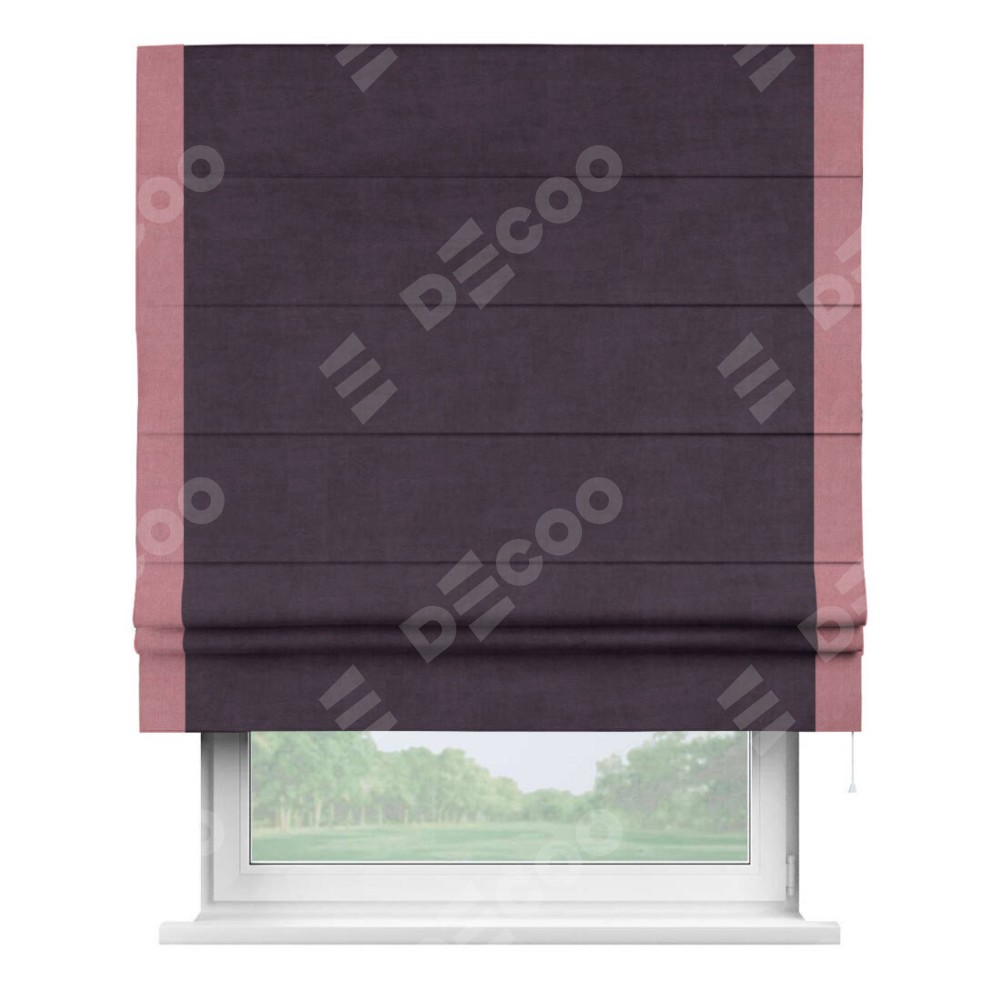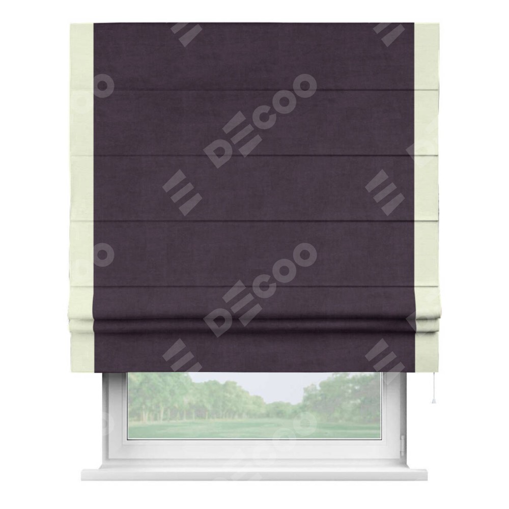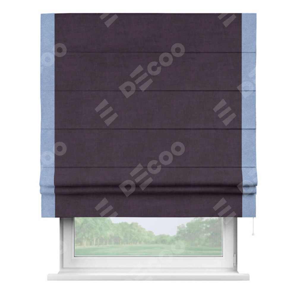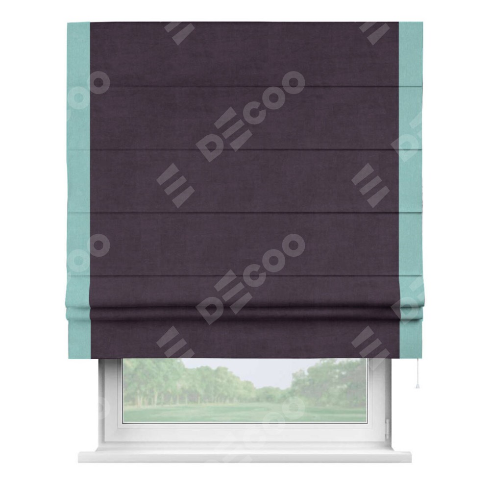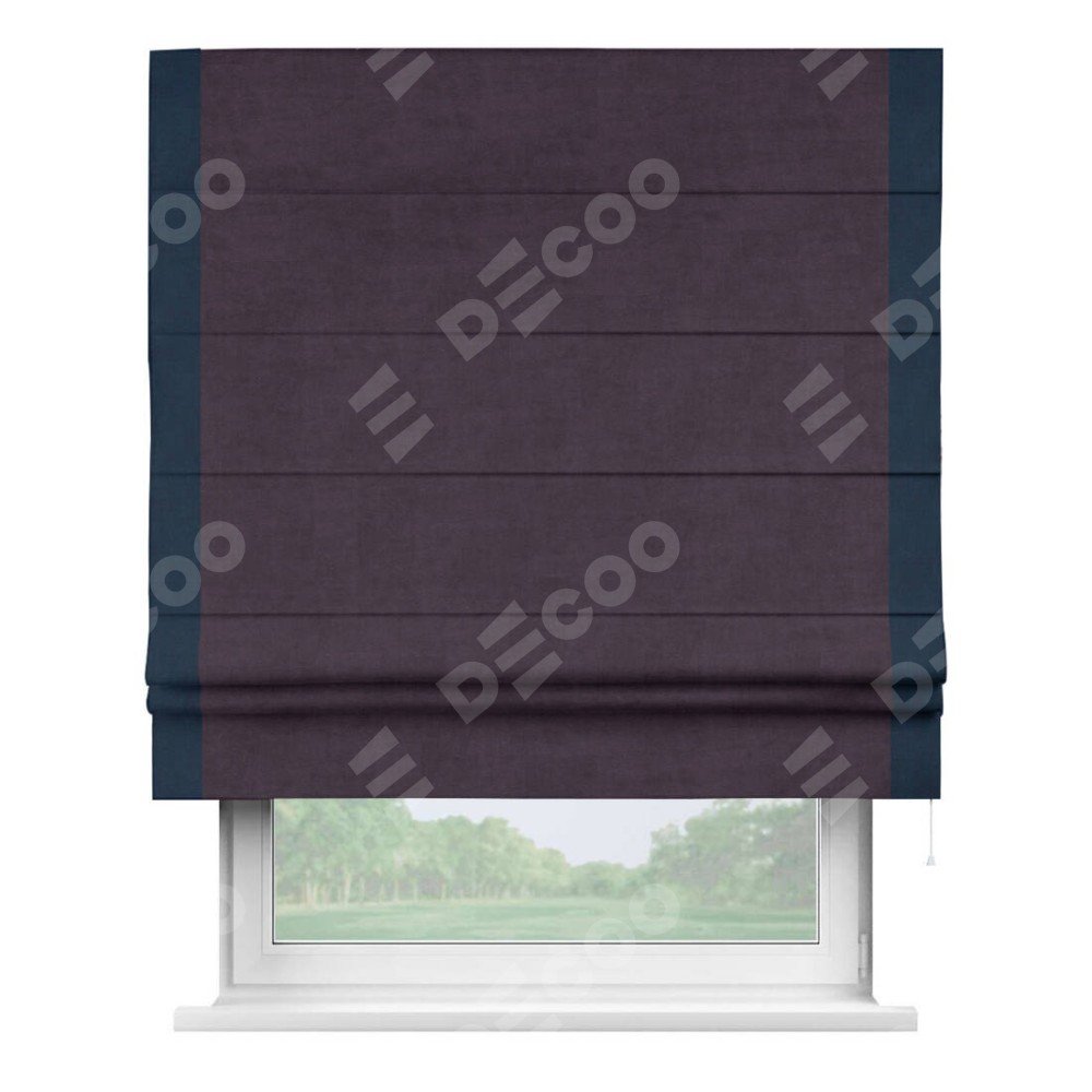 Римская штора производителя «Cortin», используется для проёма, пошита из ткани вельвет тёмно-фиолетовый, артикул ткани 72403. Отделка шторы кантом «Стрим Дуо», ткань для канта используется из вельвета разной расцветки на выбор. Имеет универсальный механизм и подходит для монтажа: на потолок, на стену и в нишу.