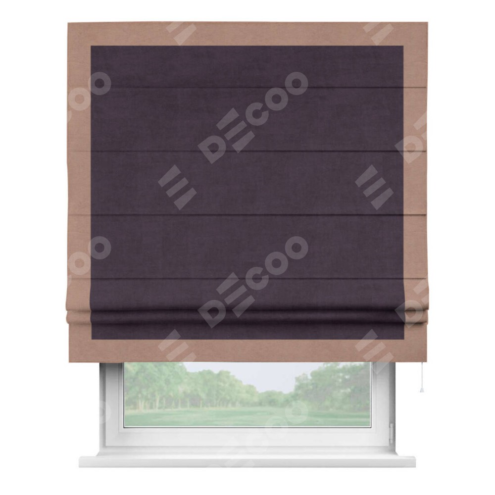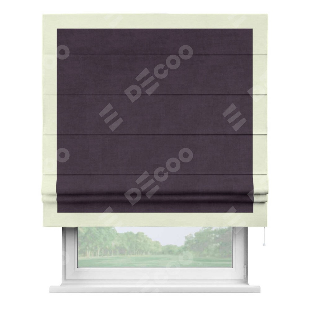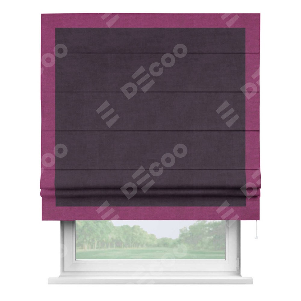 Римская штора производителя «Cortin», используется для проёма, пошита из ткани вельвет тёмно-фиолетовый, артикул ткани 72403. Отделка шторы кантом «Чесс», ткань для канта используется из вельвета разной расцветки на выбор. Имеет универсальный механизм и подходит для монтажа: на потолок, на стену и в нишу.