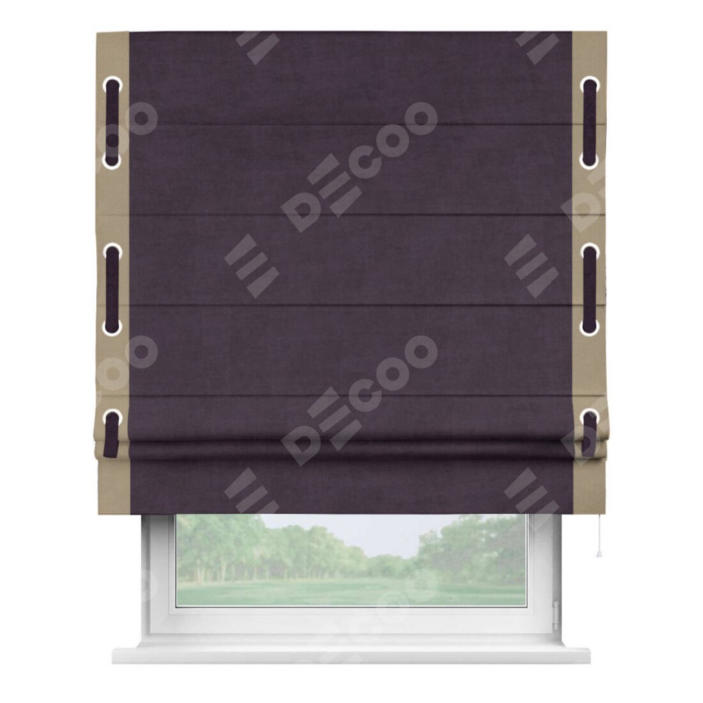 Римская штора производителя «Cortin», используется для проёма, пошита из ткани вельвет тёмно-фиолетовый, артикул ткани 72403. Отделка шторы кантом «Стрим Дуо» на кантах расположены люверсы с пояском, ткань для канта используется из вельвета разной расцветки на выбор. Ткань для пояска обычно используется из основной ткани шторы, а так же можно сделать из любой расцветки по желанию. Имеет универсальный механизм и подходит для монтажа: на потолок, на стену и в нишу.
