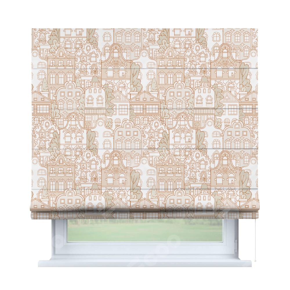 Классическая римская штора производителя «Cortin», пошита из ткани блэкаут с нанесением сублимационной печати «Милый городок». Имеет универсальный механизм и подходит для монтажа: на потолок, на стену и в нишу.