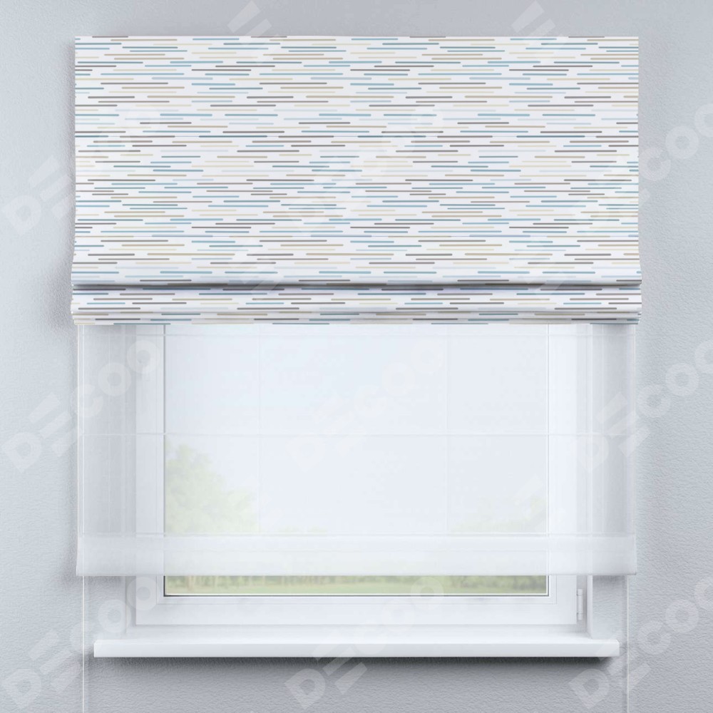 Двойная римская штора «День-ночь» от производителя Cortin предназначена для использования в проёмах. Эта штора уникальна тем, что состоит из двух полотен. На лицевой стороне находится блэкаут с нанесением сублимационной печати «Стелс», обеспечивающий эффективное затемнение. В комплект также входит вторая ткань — легкий белый тюль (артикул: V-01), который добавляет изящества и легкости оформлению окна. Кроме того, доступны и другие разновидности ткани тюль, выбор которых доступен по ссылке .