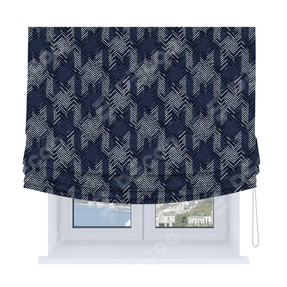 Римская штора Soft производителя «Cortin», используется для проёма, пошита из ткани блэкаут с нанесением сублимационной печати «Пёстрый зигзаг». Имеет универсальный механизм и подходит для монтажа: на потолок, на стену и в нишу. В отличие от стандартных римских штор, римская штора Soft не имеет горизонтальных вставок и нижнего отвеса. Это позволяет ткани произвольно драпироваться в свободные мягкие складки.