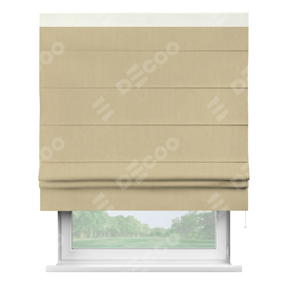 Римская штора производителя «Cortin», используется для проёма, пошита из ткани канвас бежевый, артикул ткани v-96. Отделка шторы кантом «Кинг» (молочный v-93), ткань для канта используется из канваса разной расцветки на выбор. Имеет универсальный механизм и подходит для монтажа: на потолок, на стену и в нишу.