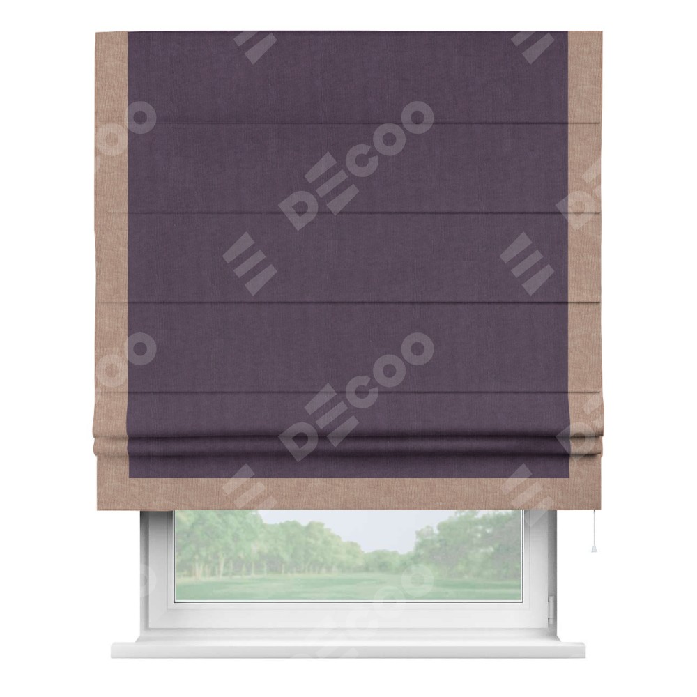 Римская штора производителя «Cortin», используется для проёма, пошита из ткани канвас баклажановый, артикул ткани v-111. Отделка шторы кантом «Виктория» (розовая пудра v-34), ткань для канта используется из канваса разной расцветки на выбор. Имеет универсальный механизм и подходит для монтажа: на потолок, на стену и в нишу.