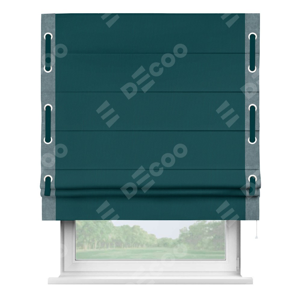Римская штора производителя «Cortin», используется для проёма, пошита из ткани канвас изумрудный, артикул ткани v-12487. Отделка шторы кантом «Стрим Дуо» (серо-голубой v-330) на кантах расположены люверсы с пояском, ткань для канта используется из канваса разной расцветки на выбор. Ткань для пояска обычно используется из основной ткани шторы, а так же можно сделать из любой расцветки по желанию. Имеет универсальный механизм и подходит для монтажа: на потолок, на стену и в нишу.