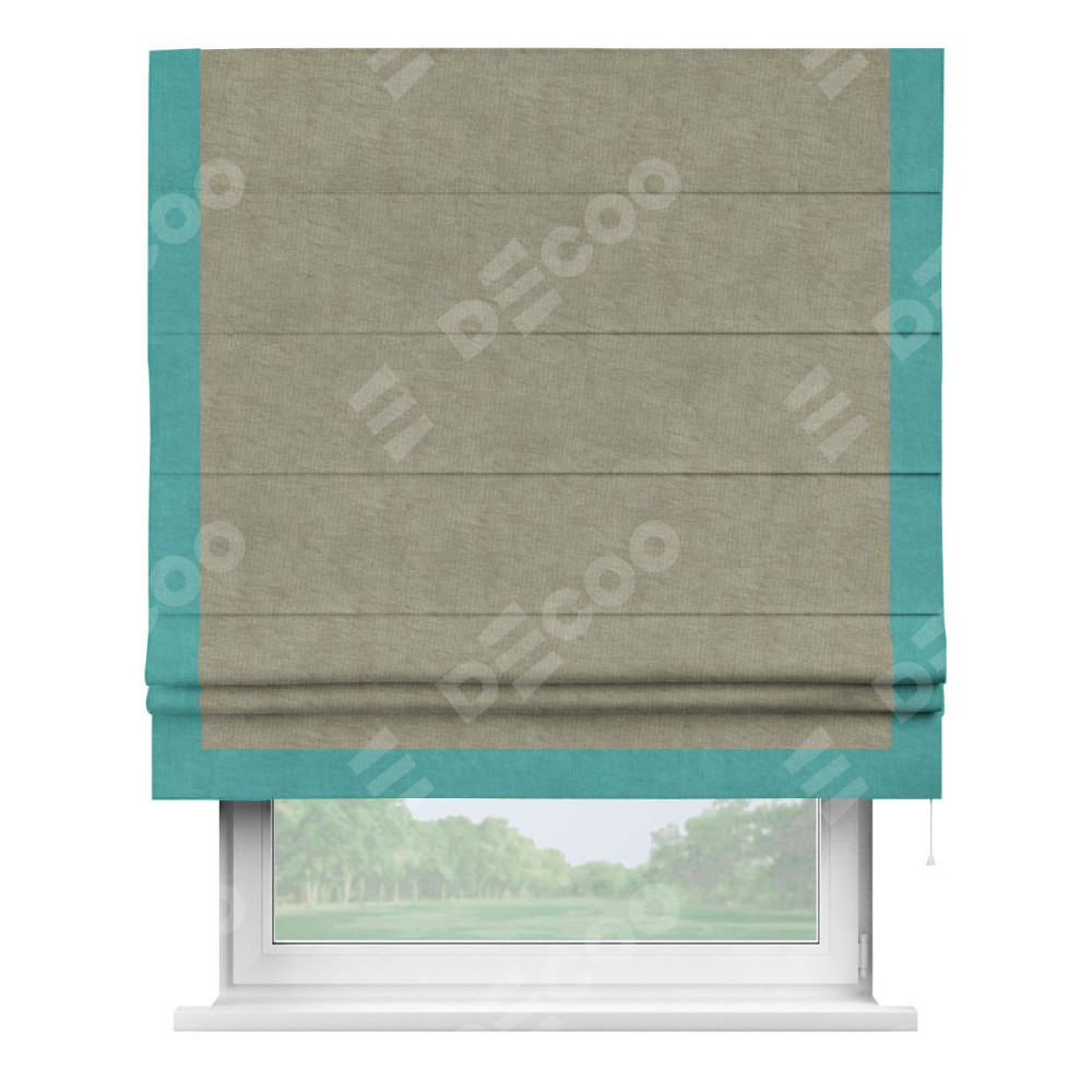 Римская штора производителя «Cortin», используется для проёма, пошита из ткани канвас капучино, артикул ткани v-211. Отделка шторы кантом «Виктория» (бирюзовый v-1048), ткань для канта используется из канваса разной расцветки на выбор. Имеет универсальный механизм и подходит для монтажа: на потолок, на стену и в нишу.