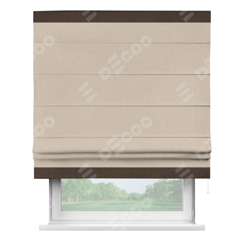 Римская штора производителя «Cortin», используется для проёма, пошита из ткани канвас кофе с молоком, артикул ткани v-07. Отделка шторы кантом «Горизонт» (махагон v-37), ткань для канта используется из канваса разной расцветки на выбор. Имеет универсальный механизм и подходит для монтажа: на потолок, на стену и в нишу.