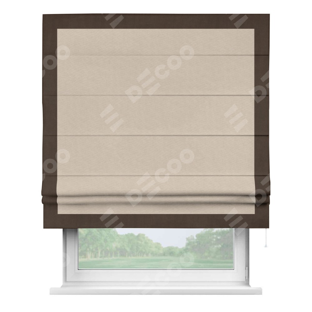 Римская штора производителя «Cortin», используется для проёма, пошита из ткани канвас кофе с молоком, артикул ткани v-07. Отделка шторы кантом «Чесс» (махагон v-37), ткань для канта используется из канваса разной расцветки на выбор. Имеет универсальный механизм и подходит для монтажа: на потолок, на стену и в нишу.