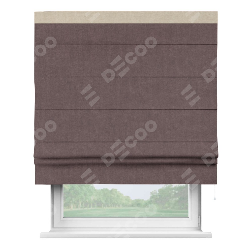 Римская штора производителя «Cortin», используется для проёма, пошита из ткани канвас махагон, артикул ткани v-37. Отделка шторы кантом «Кинг» (шоколадный v-193), ткань для канта используется из канваса разной расцветки на выбор. Имеет универсальный механизм и подходит для монтажа: на потолок, на стену и в нишу.