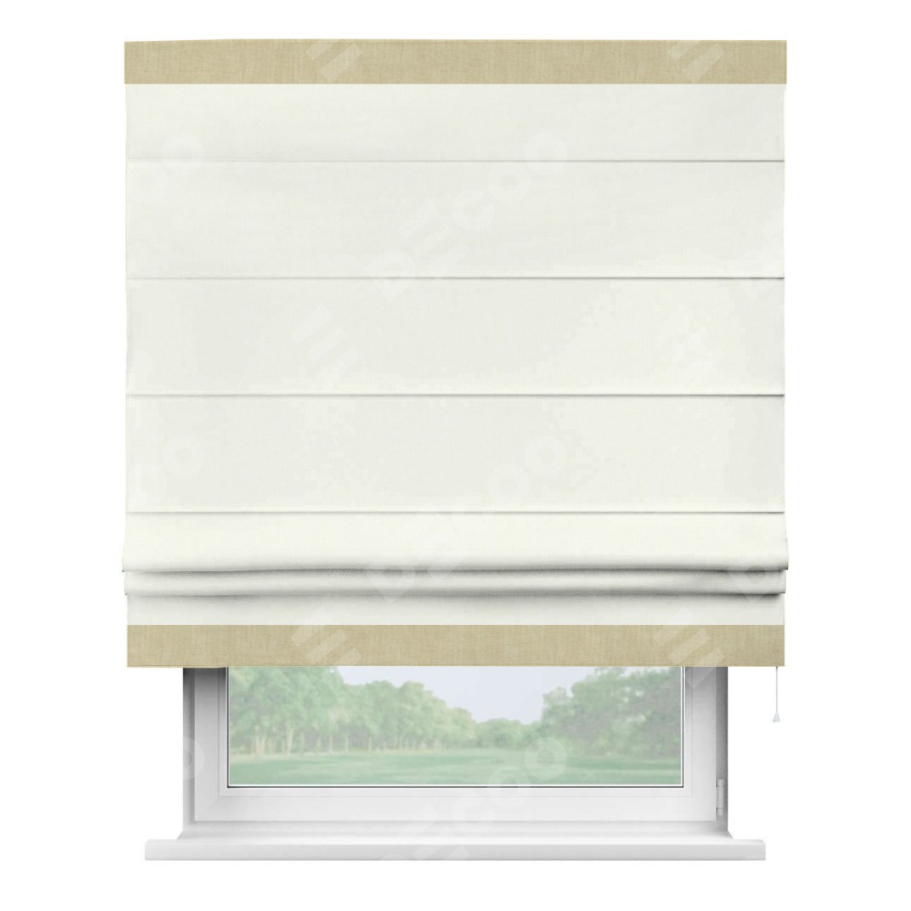 Римская штора производителя «Cortin», используется для проёма, пошита из ткани канвас молочный, артикул ткани v-93. Отделка шторы кантом «Горизонт» (тёмно-бежевый v-196), ткань для канта используется из канваса разной расцветки на выбор. Имеет универсальный механизм и подходит для монтажа: на потолок, на стену и в нишу.