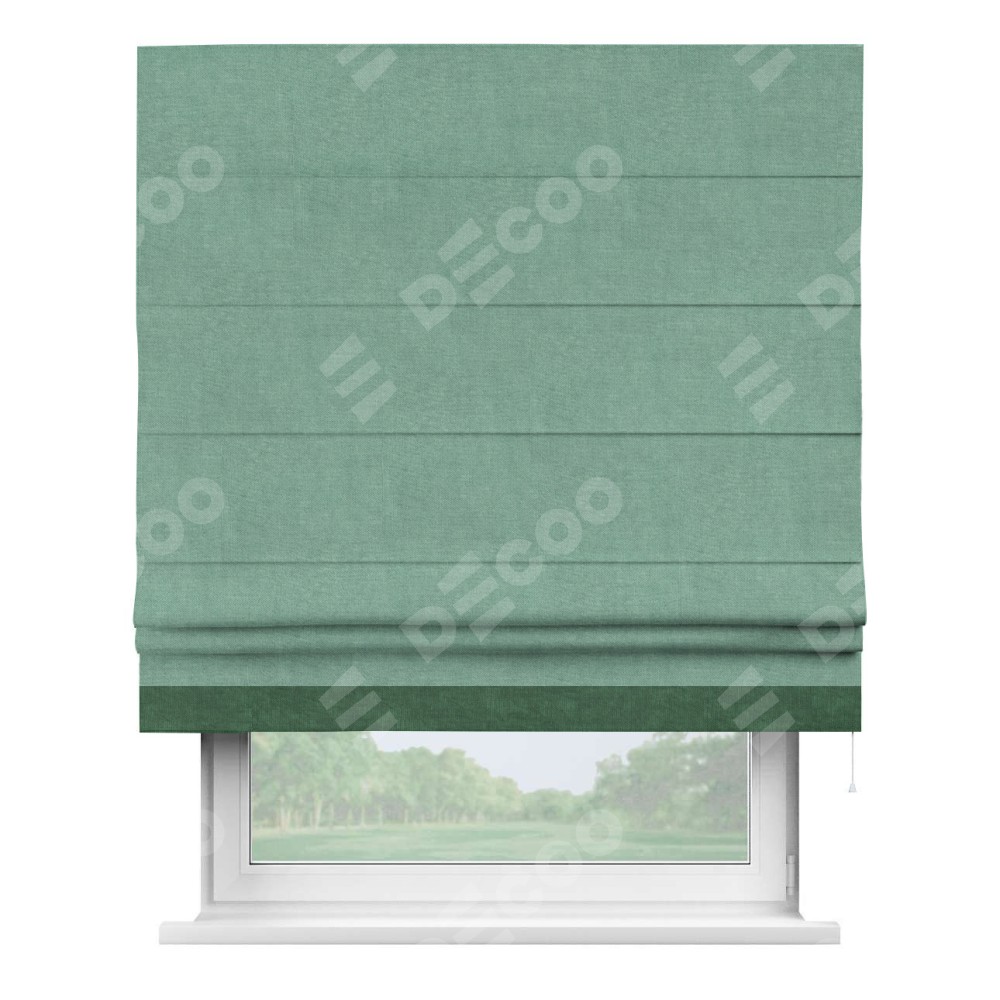 Римская штора производителя «Cortin», используется для проёма, пошита из ткани канвас мятный, артикул ткани v-248. Отделка шторы кантом «Джестер» (тёмно-зелёный v-469), ткань для канта используется из канваса разной расцветки на выбор. Имеет универсальный механизм и подходит для монтажа: на потолок, на стену и в нишу.