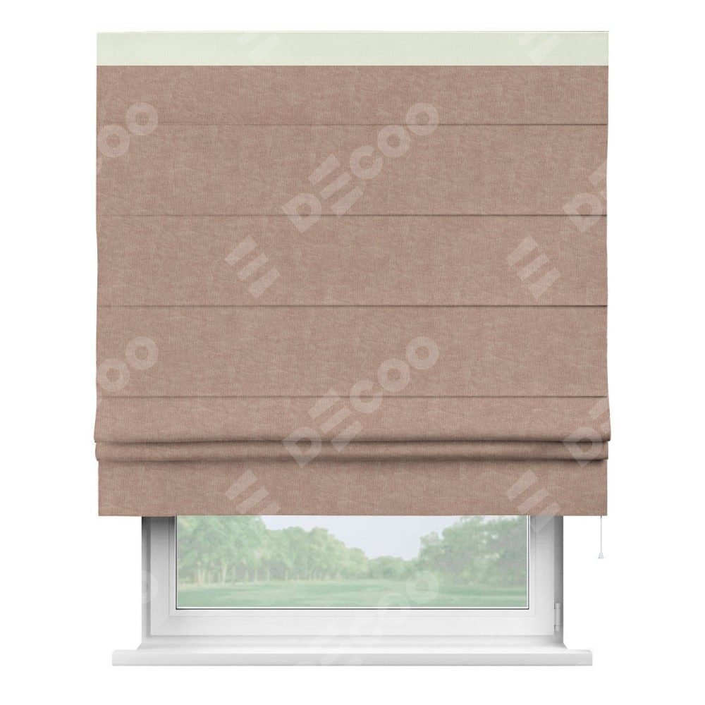 Римская штора производителя «Cortin», используется для проёма, пошита из ткани канвас розовая пудра, артикул ткани v-34. Отделка шторы кантом «Кинг» (сливочный v-94), ткань для канта используется из канваса разной расцветки на выбор. Имеет универсальный механизм и подходит для монтажа: на потолок, на стену и в нишу.