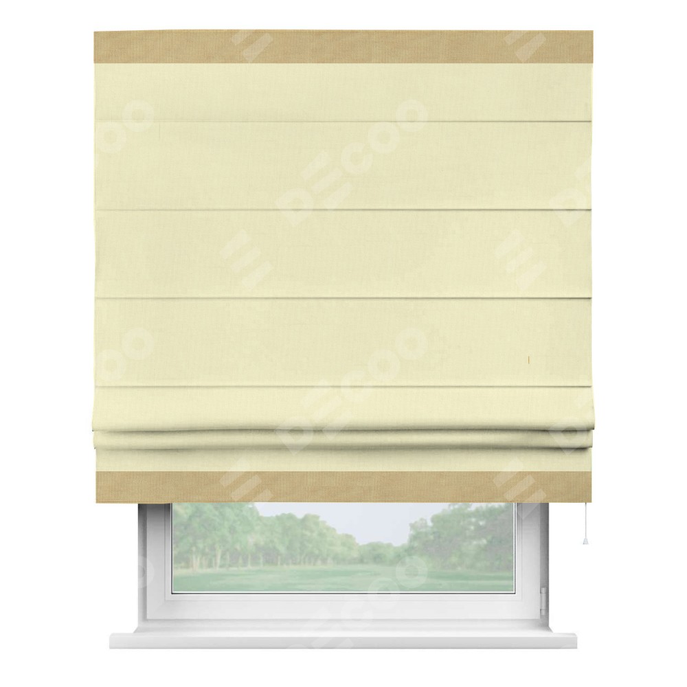 Римская штора производителя «Cortin», используется для проёма, пошита из ткани канвас светло-бежевый, артикул ткани v-250. Отделка шторы кантом «Горизонт» (абрикосовый v-448), ткань для канта используется из канваса разной расцветки на выбор. Имеет универсальный механизм и подходит для монтажа: на потолок, на стену и в нишу.