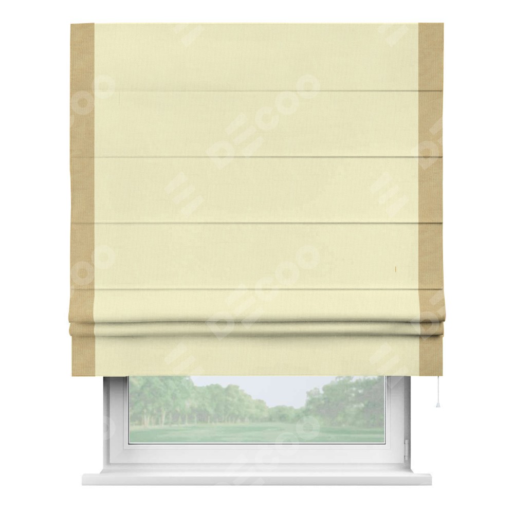 Римская штора производителя «Cortin», используется для проёма, пошита из ткани канвас светло-бежевый, артикул ткани v-250. Отделка шторы кантом «Стрим Дуо» (абрикосовый v-448), ткань для канта используется из канваса разной расцветки на выбор. Имеет универсальный механизм и подходит для монтажа: на потолок, на стену и в нишу.
