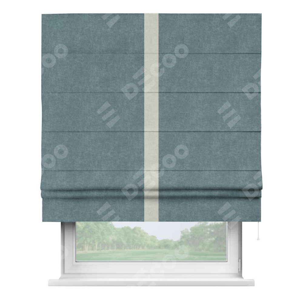 Римская штора производителя «Cortin», используется для проёма, пошита из ткани канвас серо-голубой, артикул ткани v-330. Отделка шторы кантом «Хайвей» (светло-серый v-371), ткань для канта используется из канваса разной расцветки на выбор. Имеет универсальный механизм и подходит для монтажа: на потолок, на стену и в нишу.