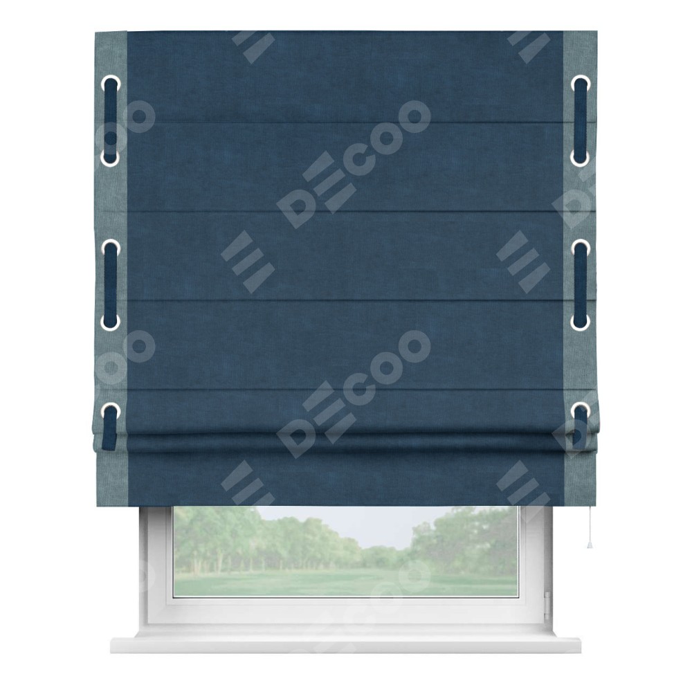 Римская штора производителя «Cortin», используется для проёма, пошита из ткани канвас синий, артикул ткани v-573. Отделка шторы кантом «Стрим Дуо» (серо-голубой v-330) на кантах расположены люверсы с пояском, ткань для канта используется из канваса разной расцветки на выбор. Ткань для пояска обычно используется из основной ткани шторы, а так же можно сделать из любой расцветки по желанию. Имеет универсальный механизм и подходит для монтажа: на потолок, на стену и в нишу.