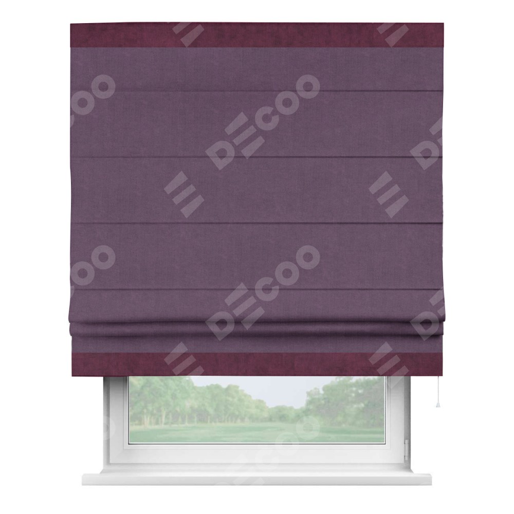 Римская штора производителя «Cortin», используется для проёма, пошита из ткани канвас сиреневый, артикул ткани v-98. Отделка шторы кантом «Горизонт» (фиолетовый v-99), ткань для канта используется из канваса разной расцветки на выбор. Имеет универсальный механизм и подходит для монтажа: на потолок, на стену и в нишу.