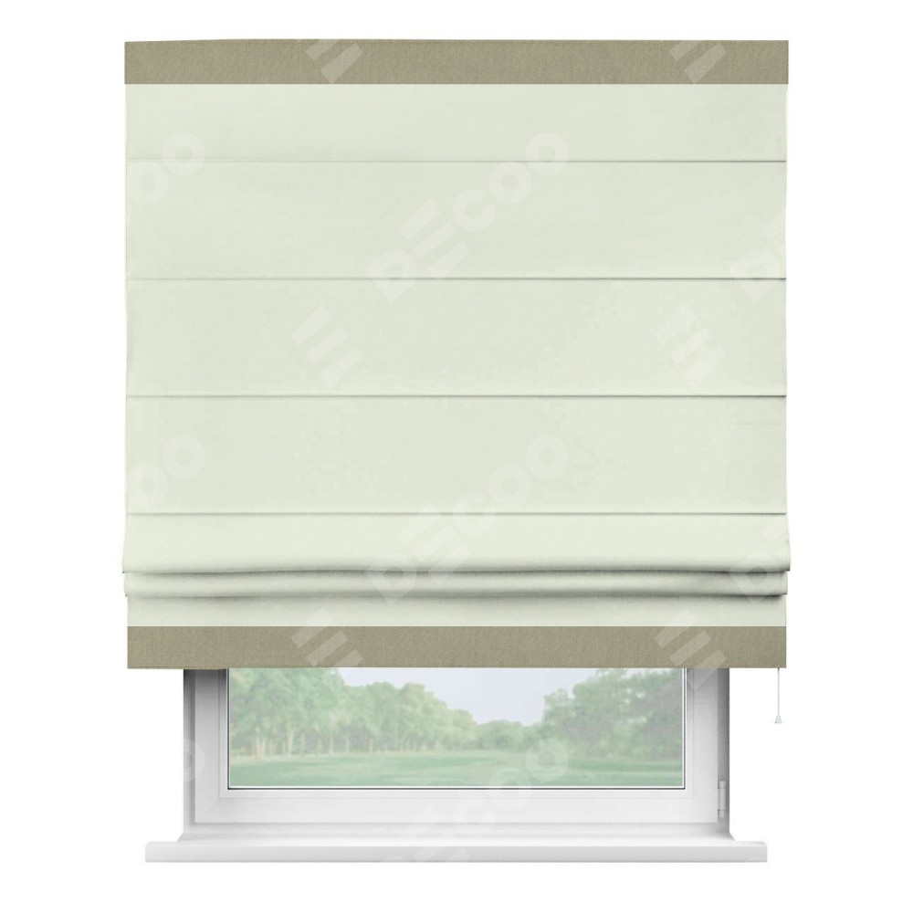 Римская штора производителя «Cortin», используется для проёма, пошита из ткани канвас сливочный, артикул ткани v-94. Отделка шторы кантом «Горизонт» (латте v-12490), ткань для канта используется из канваса разной расцветки на выбор. Имеет универсальный механизм и подходит для монтажа: на потолок, на стену и в нишу.