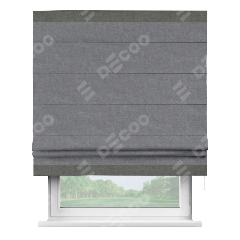 Римская штора производителя «Cortin», используется для проёма, пошита из ткани канвас стальной, артикул ткани v-1082. Отделка шторы кантом «Горизонт» (тёмно-серый v-340), ткань для канта используется из канваса разной расцветки на выбор. Имеет универсальный механизм и подходит для монтажа: на потолок, на стену и в нишу.