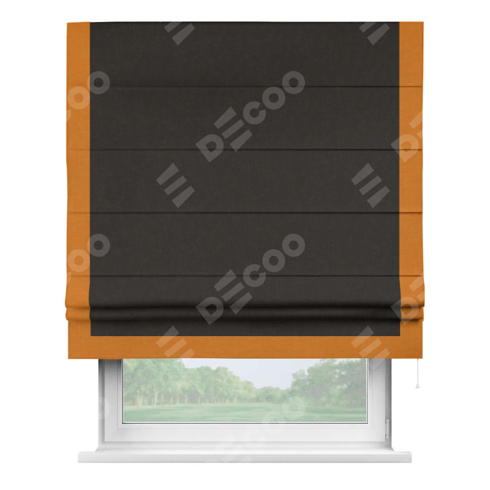 Римская штора производителя «Cortin», используется для проёма, пошита из ткани канвас тёмно-коричневый, артикул ткани v-13. Отделка шторы кантом «Виктория» (оранжевый v-106), ткань для канта используется из канваса разной расцветки на выбор. Имеет универсальный механизм и подходит для монтажа: на потолок, на стену и в нишу.