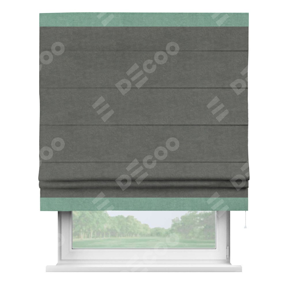 Римская штора производителя «Cortin», используется для проёма, пошита из ткани канвас тёмно-серый, артикул ткани v-340. Отделка шторы кантом «Горизонт» (мятный v-248), ткань для канта используется из канваса разной расцветки на выбор. Имеет универсальный механизм и подходит для монтажа: на потолок, на стену и в нишу.