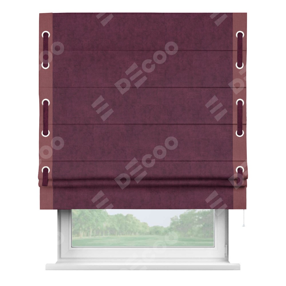 Римская штора производителя «Cortin», используется для проёма, пошита из ткани канвас фиолетовый, артикул ткани v-99. Отделка шторы кантом «Стрим Дуо» (ягодный v-28) на кантах расположены люверсы с пояском, ткань для канта используется из канваса разной расцветки на выбор. Ткань для пояска обычно используется из основной ткани шторы, а так же можно сделать из любой расцветки по желанию. Имеет универсальный механизм и подходит для монтажа: на потолок, на стену и в нишу.