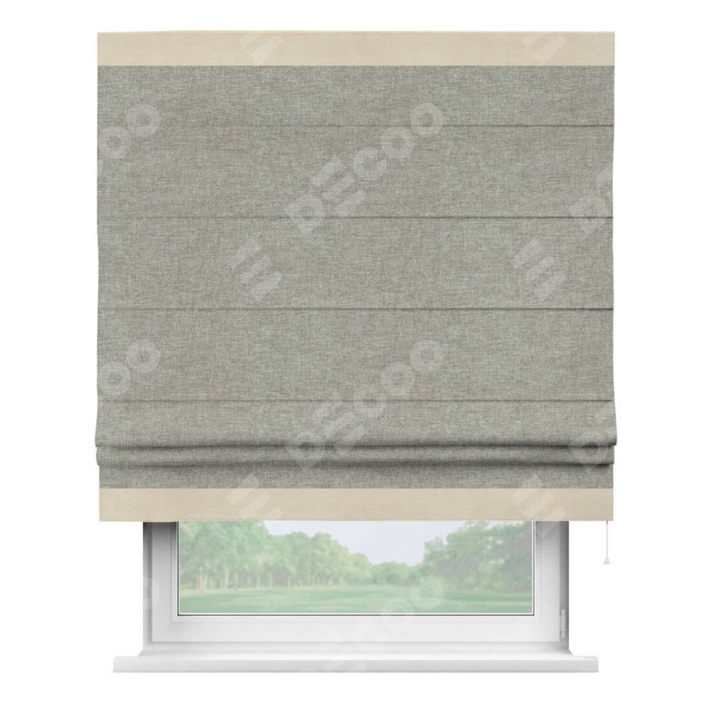 Римская штора производителя «Cortin», используется для проёма, пошита из ткани лён кашемир серый, артикул 17208. Отделка шторы кантом «Горизонт», ткань для канта используется из льна разной расцветки на выбор. Имеет универсальный механизм и подходит для монтажа: на потолок, на стену и в нишу.