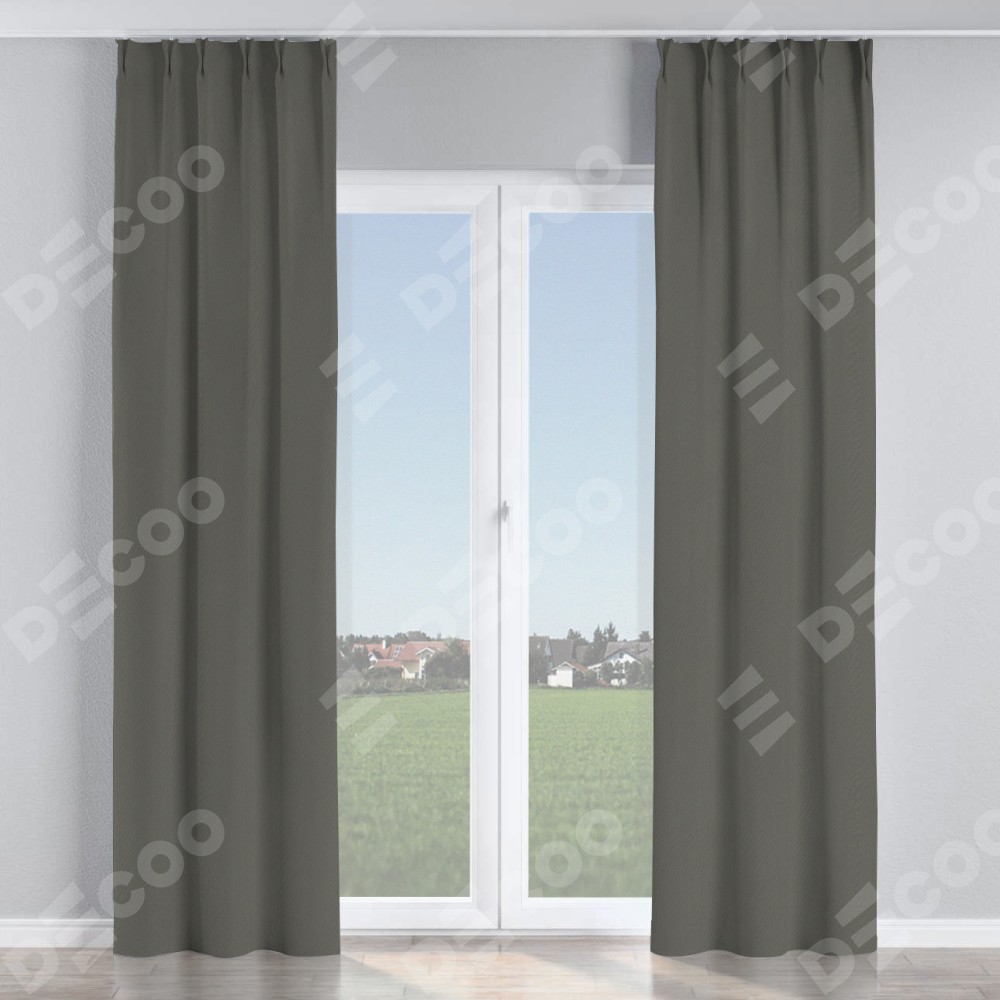 Комплект прямых штор, от производителя «Cortin», пошиты из ткани блэкаут однотонный тёмно-серый, артикул ткани 91570. С изнаночной стороны в верхней части штор пристрачивается шторная лента с декоративными складками «Кустик». Для создания элегантных складок прямые шторы шьются по стандарту с коэффициентом 1:2 (на 100 см. ширины проёма 200 см. ширины ткани).
